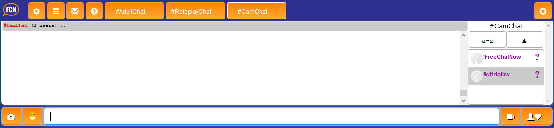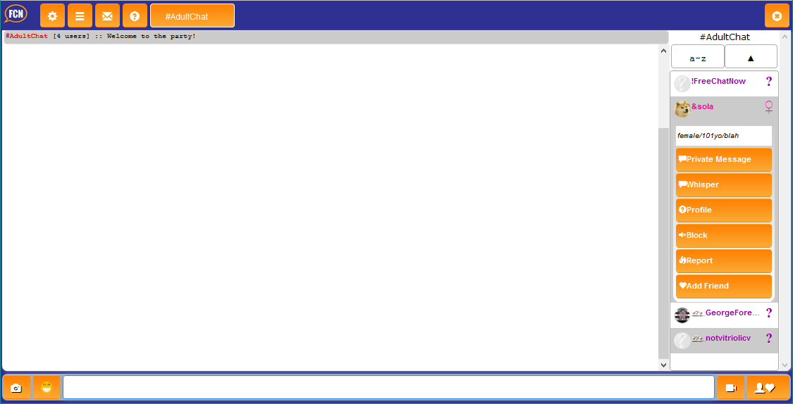Upon first entering the chat, after a brief loading sequence, this is what you will see. You will have been automatically joined to the room you elected to start from, but you can always join other rooms -- even all of them, if you'd like. You can see that the room shows a few lines of text that other users typed before you joined, which is meant to help you figure out what the active topic of conversation is and get you up to speed.