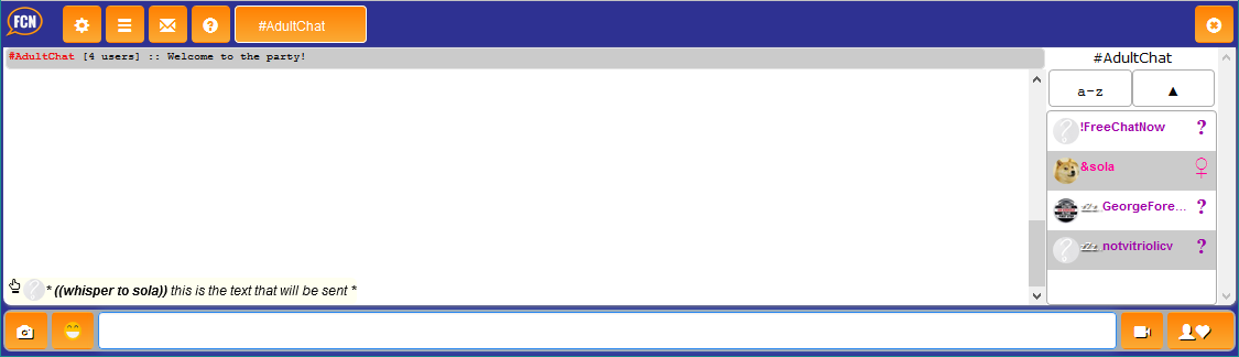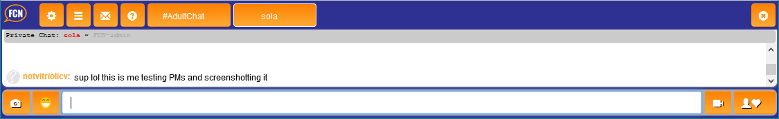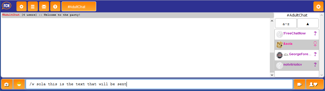 So, now that we're back at the main chat room, we might want to send private messages to other users directly without leaving the flow of chat. Click the user's name, and select "whisper" to do this, just like how "whisper" messages work on most chat sites. This will automatically fill the input field with the preamble needed to send a whisper message to any user, which you can also feel free to key manually, ie "/w vitriolicv". Type your message, starting after this preamble, and press your enter key.