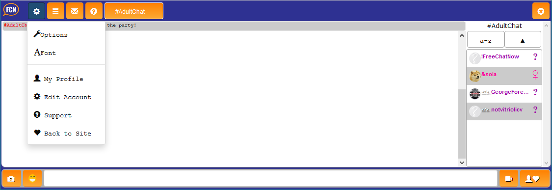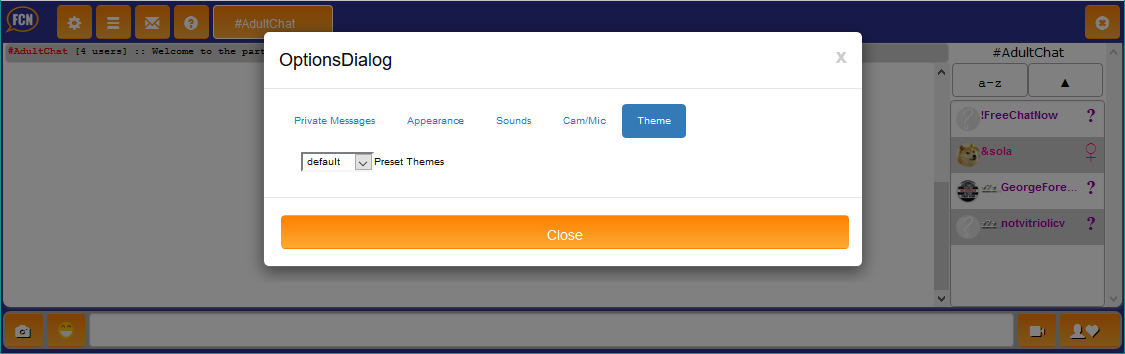 With that done, we can play around with the options a little. The first menu bar option, the ⚙ symbol, gives us a dropdown box with some selections. Under "options," you can change many preferences relating to position, theme, sound, and how your media, such as webcam and microphone, are handled. "Font" lets you change how text you send to chat rooms and other users is displayed. The rest are fairly self-explanatory. Feel free to poke around!