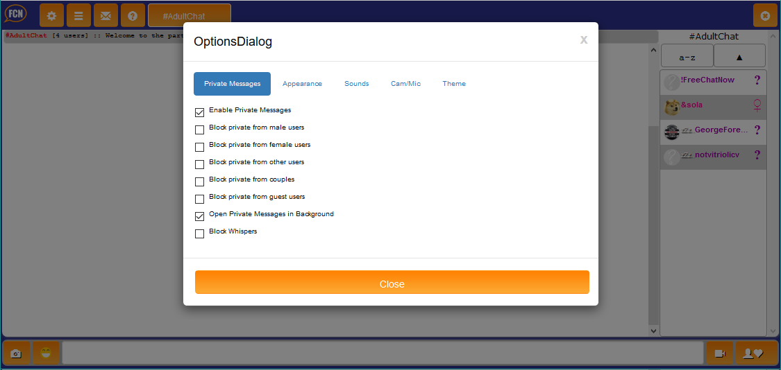 Let's click on "options" to see the Options Dialog. We can see that there are several categories. The first category is options concerning private messages. Here, we can enable or disable private messages entirely, depending on whether we'd rather or not be bothered, or block them from people of specific genders or unregistered guest users. By default, all private messages are accepted. We can also decide whether we would like private messages brought immediately to the foreground or background when received, and, finally, we can disable whispers if we would truly rather only be contacted publicly.