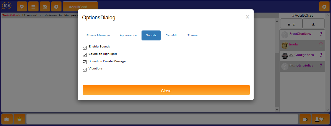 The next section, "sounds," is much simpler. Sounds can be disabled for all functions, or individually toggled for highlights (when someone enters your username in a room or message you are able to see) and incoming private messages. The vibration function for phones can also be toggled here. It makes sense, since all sounds are vibrations anyway, right? Hey, where would you put it?