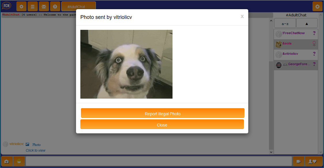 Once you click to open the image, it will be presented to you, taking up as much screen space as is possible or necessary to present it, along with two buttons. The second button closes the picture and returns you to your chat session in progress. The first button, "report illegal photo," however, allows you to notify moderators that illegal content has been uploaded. Do not abuse this feature. If users abuse this feature, moderators will take reports less seriously, and important reports could be overlooked.