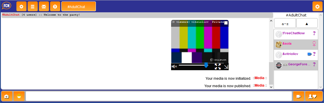 Once published, the chat notifies you first that your media is initialized, then that it is published; if you get different messages than this, you may wish to perform your own troubleshooting, particularly related to whether you have allowed or denied your browser access to your streaming devices in the past, before contacting an administrator. After this, your username in the user list will show that you are broadcasting, and you will see a preview window containing your video, if applicable, and a volume slider and mute button, if applicable. The preview window can be arbitrarily repositioned and resized within the chat window, as can the view frame for any webcam you're watching.